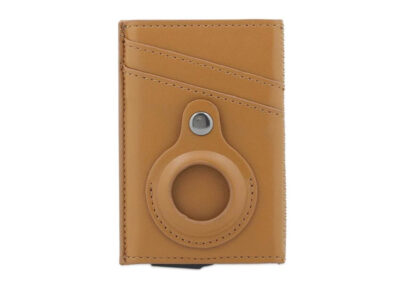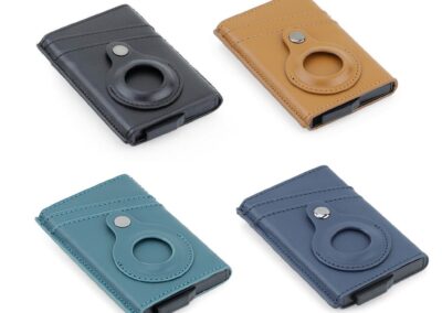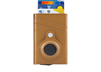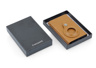 Contemporary, durable and high-quality RFID cardholder with Santhome Tag / Airtag pocket. The holder has a sliding mechanism and fits 5 cards in the case with anti-skimming RFID technology. Additional pockets outside help fit 4 additional cards, so total 9 cards can be carried at once. Pocket is suited to fit Apple Airtag or Santhome Tag that can track your card wallet worldwide so you never lose your credit and ID cards again. Packed in a gift box.