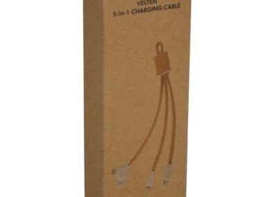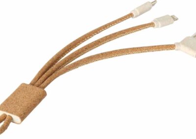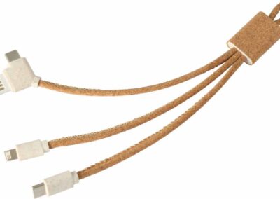 Sustainable 5-in-1 charging cable made with cork and wheatstraw material. Comes with Type C, micro USB and Lightning cable outputs and USB input. Includes a keyring loop.