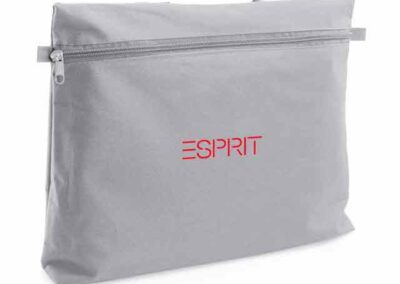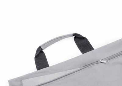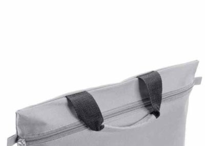Document bag with zipper closure in soft 600D polyester finish in bright tones. With reinforced carrying handles in matching color, zipper and matching color side holders.