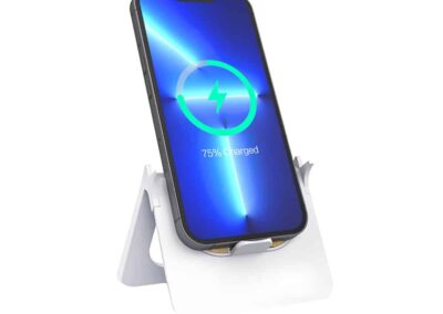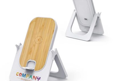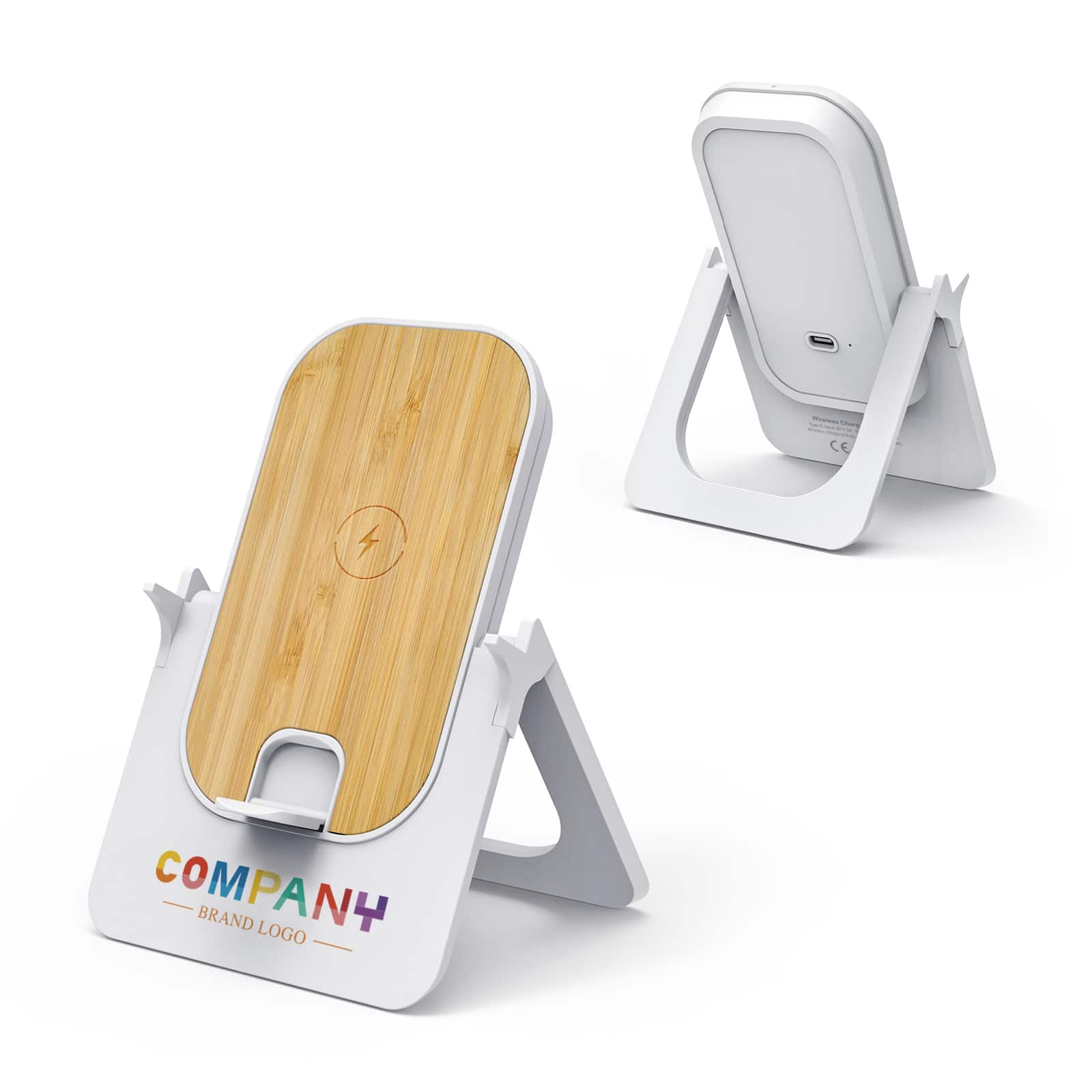 Eco-Fast Charger combines a fast 15W wireless charger with a stand, so you can quickly recharge your phone and use it to view media at the same time. It can be used in portrait or landscape mode. It is made of eco-friendly materials like wheat straw and cork and has a large area for prominently displaying your company logo or brand!