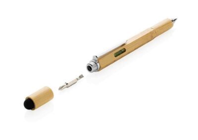 Multifunction bamboo pen with ruler (7cm) , spirit level, screw driver, stylus tip and ballpoint. Made from bamboo with aluminium clip. German Documental Ink (Blue)