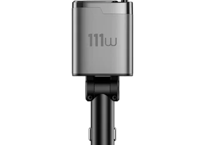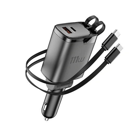 Redefine your in-car charging with the WiWU Helix Pro. This is the most powerful and convenient car charger we’ve ever made. Its standout feature is the dual, built-in 80cm retractable Type-C cables that extend smoothly and retract with a single pull, eliminating cable clutter forever. Powered by a triple-chip architecture, it delivers a groundbreaking 111W of total power, capable of fast-charging laptops, tablets, and multiple smartphones simultaneously. The intelligent digital display provides a real-time voltage readout, while the soft ambient light makes it easy to find in the dark. The body is crafted from premium aluminum alloy for superior heat dissipation, ensuring a safe, low-temperature charge even when all ports are in use. The Helix Pro is the all-in-one power solution for family road trips, business travel, and daily commutes.