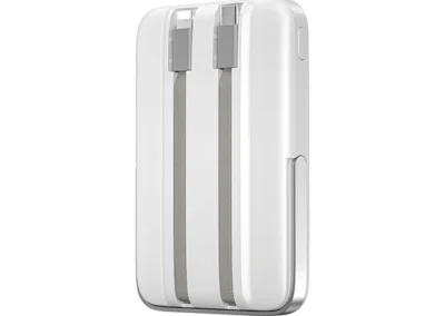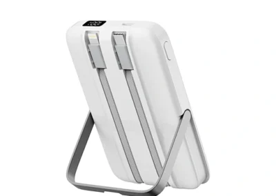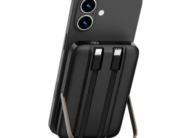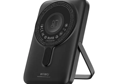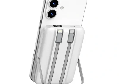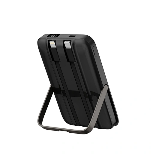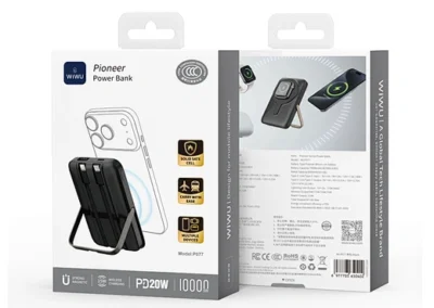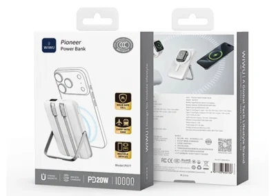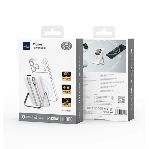 Meet the power bank that does it all. The WiWU Pioneer 5-in-1 is meticulously engineered to be the perfect power companion for your entire tech collection. The front features a powerful magnetic charging pad for your iPhone, while the back houses a dedicated wireless module for your Apple Watch. Tucked neatly into its body are two built-in fast-charging cables—one USB-C and one Lightning—ready for your iPad or other gadgets. Need to go hands-free? The integrated zinc alloy kickstand provides a stable viewing angle for watching videos while you charge. With a 10000mAh capacity and support for 20W Power Delivery, the Pioneer is the smartest and most versatile way to keep your entire ecosystem powered up, at home or on the go.