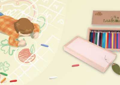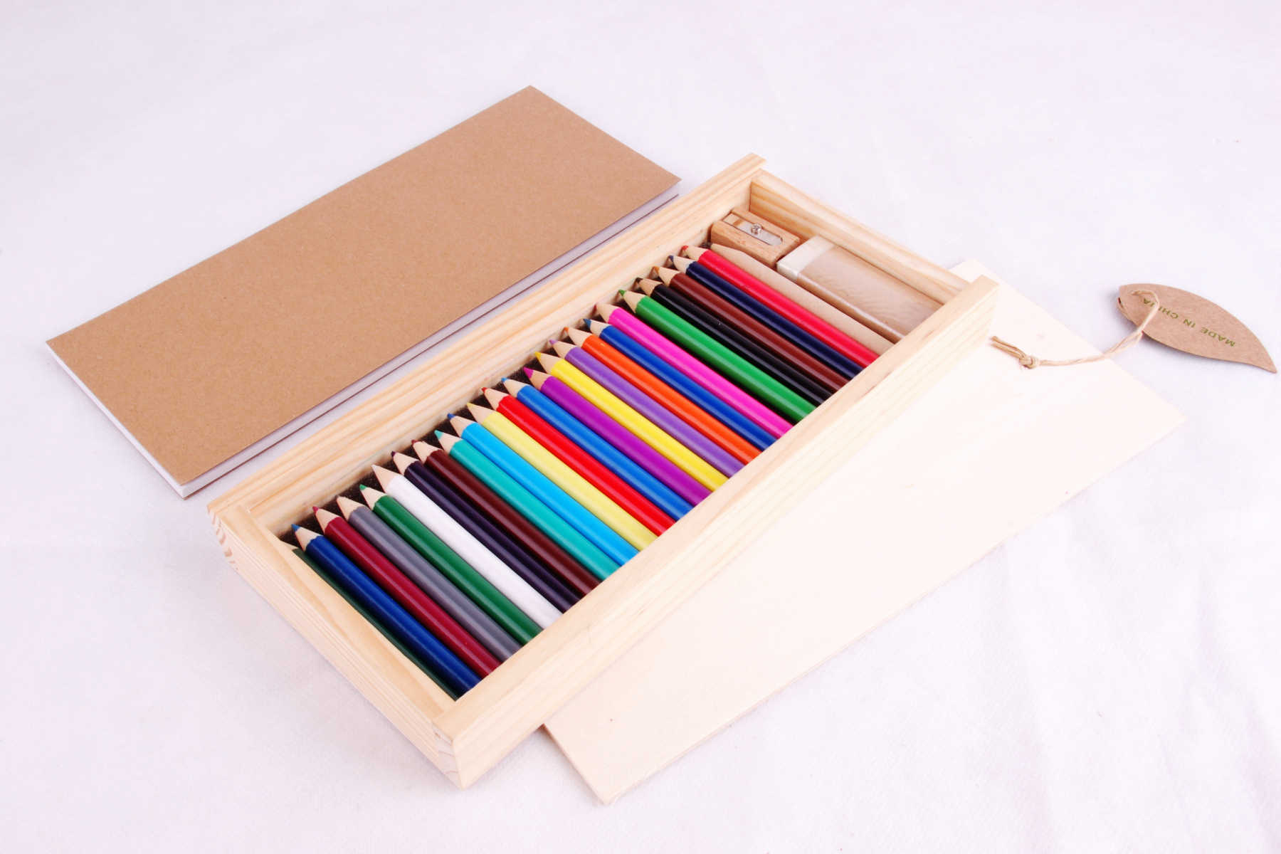 A box of 24 pieces color pencils with a drawing pad and 1 writing pencil, sharpener and eraser. Product Size: 23×10.4×2.7cm. Packaging: Polybag