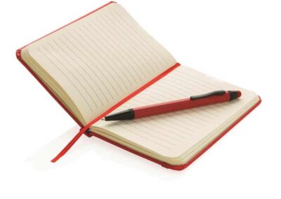 Ruled A6 hardcover classic notebook set including aluminium stylus pen. With elastic closure and bookmark ribbon. 144 pages of 70g/m2 inside. Cream coloured pages. Packed in Gift box.