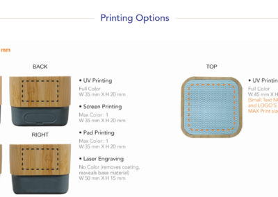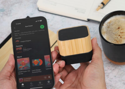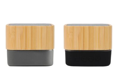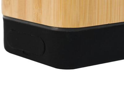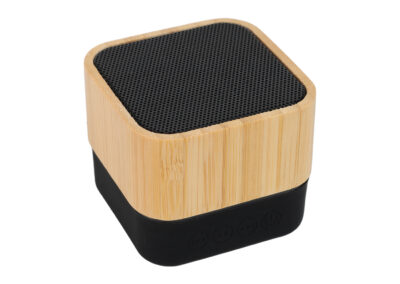 Eco-friendly bluetooth speaker, made from bamboo with a playtime of 4 hours, equipped with a micro SD card slot. It comes with a micro USB charging cable and a loudspeaker output of 3W.