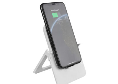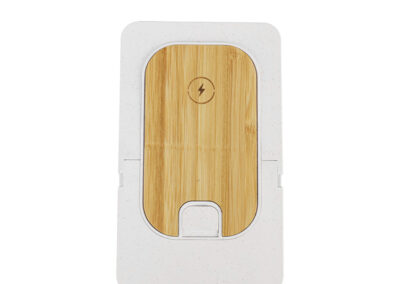 Wireless charger made from abs plastic + bamboo material featuring a foldable stand. It features a type-C input & comes with a 1m type-C charging cable.