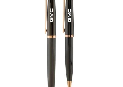 ZORY is a luxury gift set containing 2 Santhome® pens in gold / black color. Features 1 rollerball and 1 ballpoint pen with soft spring mechanism and lacquered finish with premium texturing. Packed in a gift set box.
