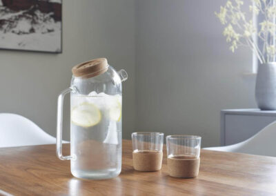 Hans Larsen Zossen is an elegant, must-have gift set for every home or office dining table – Set of durable borosilicate glass carafe jar with cork lid, with 2 matching borosilicate glass tumblers with cork base. Added infuser in the spout allows you to add your favorite fruits, herbal teas, etc. for infusion with water in carafe. Carafe Capacity: 1.8L and Tumbler Capacity: 240ml each.